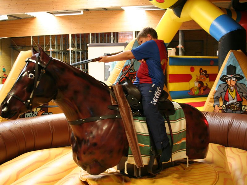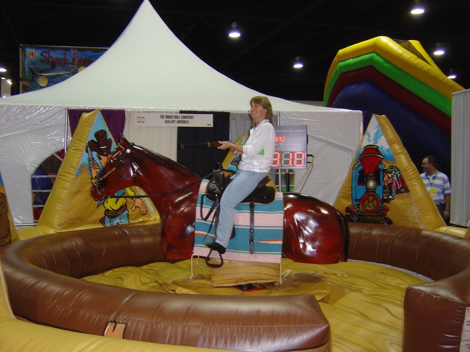 There are six inflatable outlaws that are set up around the back of the mechanical bull ring. Each outlaw has IR sensors going through each outlaw. To play the game a rider hops on the horse he chooses a replica rifle or pistol. The operator starts the horse moving slowly as the player shoots at the outlaws for one minute. There are six outlaws to shoot at. The red light on the score starts flashing when the time is up. The highest score is always showing on the scoring unit as well as the score the player just got.